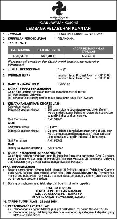 Permohonan Jawatan Kosong Lembaga Pelabuhan Kuantan (LPKTN).