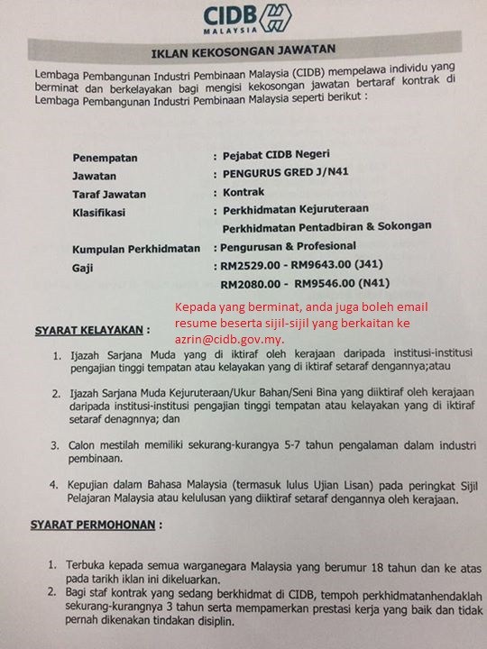 - Nama Majikan: Lembaga Pembangunan Industri Pembinaan Malaysia (CIDB)