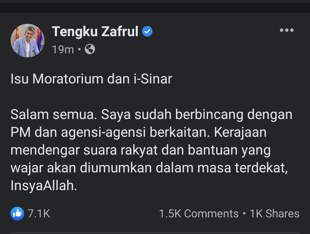 Sementara itu, Menteri Kewangan, Tengku Zafrul, turut memaklumkan bahawa isu moratorium dan i-Sinar telah diambil kira dan suara rakyat didengari oleh pihak Kerajaan berkaitan hal tersebut. Rujuk