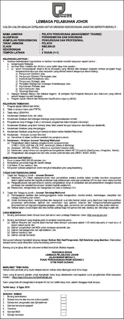 Permohonan Jawatan Kosong Lembaga Pelabuhan Johor.