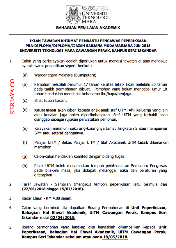 Permohonan Jawatan Kosong UITM ~ Kekosongan Pembantu Pengawas Peperiksaan.