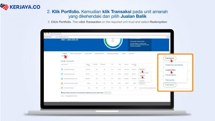 Langkah 2: Klik Portfolio. Kemudian Klik Transaksi Pada Unit Amanah Dikehendaki dan pilih Jualan Balik