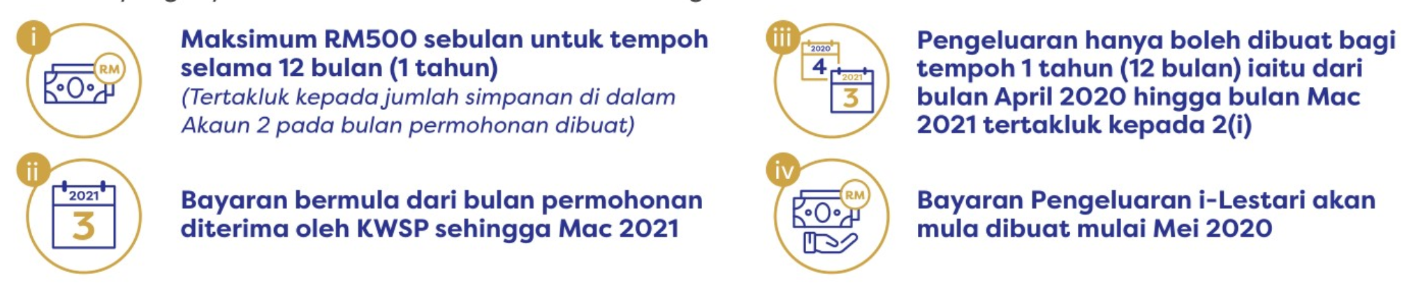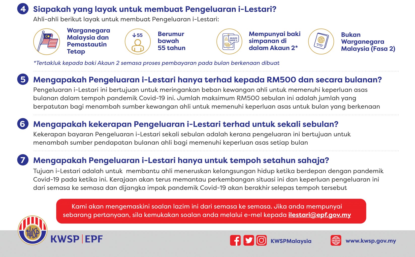 Melalui kemudahan pengeluaran i-Lestari ini, pencarum mendapat kemudahan untuk membuat pengeluaran dari akaun 2 KWSP akibat dari kesan penularan COVID-19. Pencarum KWSP yang berumur di bawah 55 tahun layak untuk membuat pendaftaran dan pengeluaran i-Lestari akaun 2 KWSP sehingga RM500 sebulan.