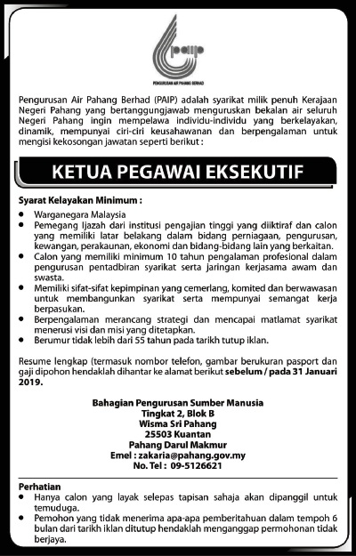 - Nama Majikan: Pengurusan Air Pahang Berhad (PAIP)