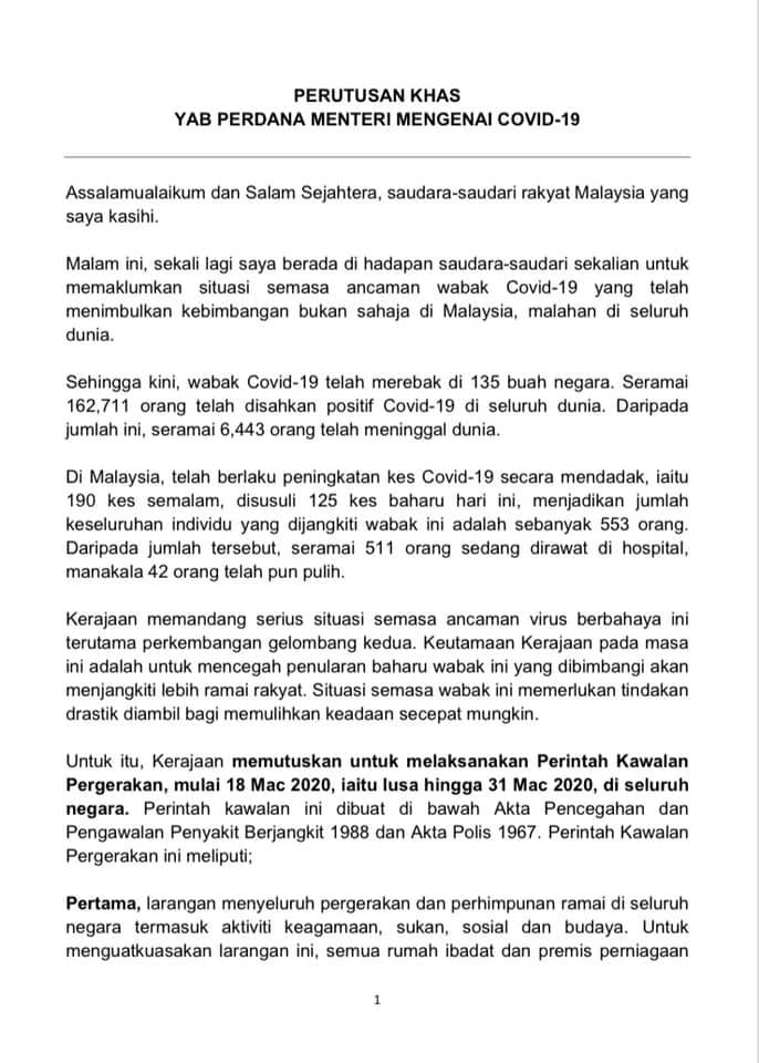 Anda boleh rujuk teks Perutusan Khas Perintah Kawalan Pergerakan lengkap di bawah untuk lebih maklumat.