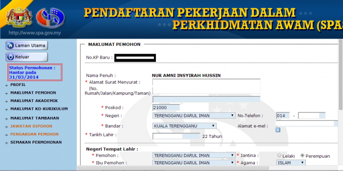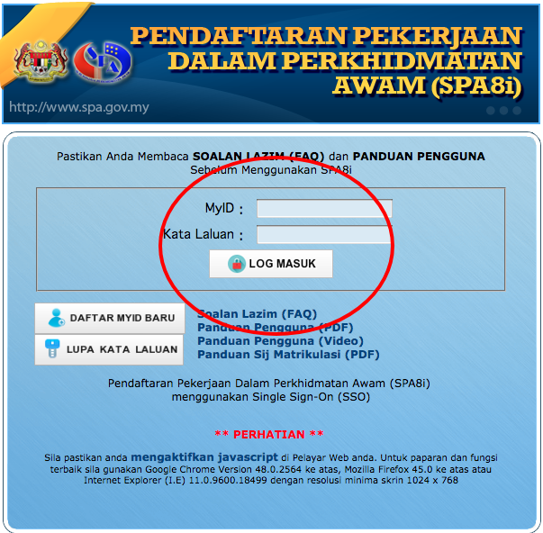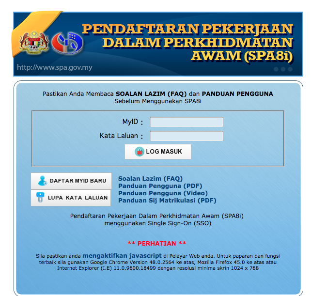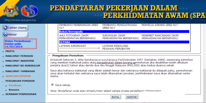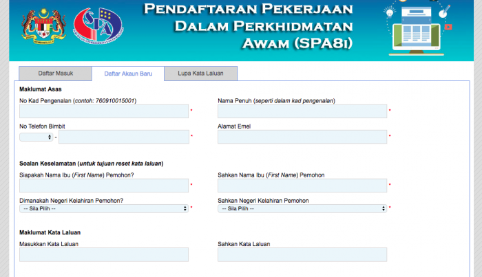 - Sahlaku permohonan bagi calon baru yang telah memohon melalui Borang Permohonan Pekerjaan Dalam Perkhidmatan Awam (SPA8i) adalah selama satu tahun. Calon perlu isi semula permohonan selepas tempoh tersebut.