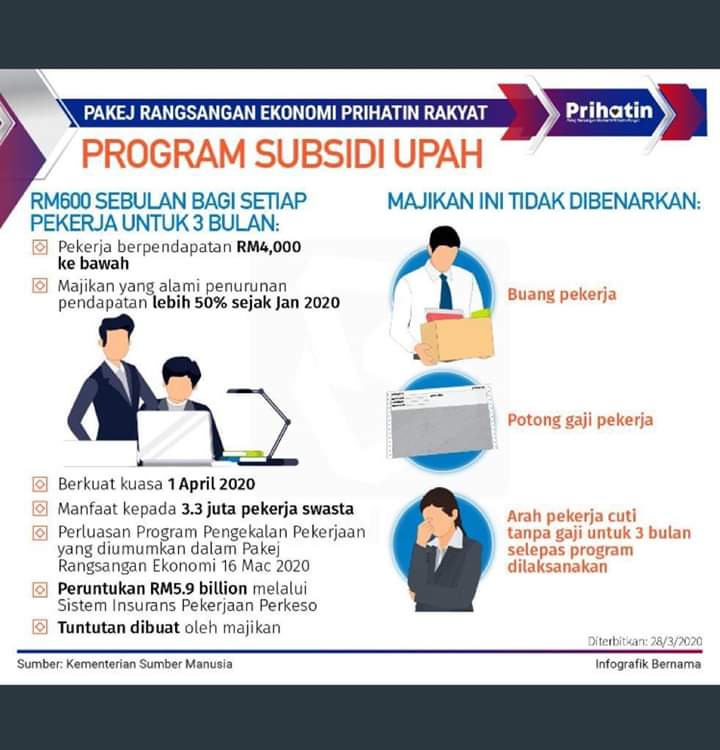 Majikan perlu membuat tuntutan bagi pihak pekerja untuk pelaksanaan Program Subsidi Upah yang diumum kerajaan pada 27 Mac lepas iaitu pemberian RM600 kepada pekerja setiap bulan selama 3 bulan. Pemberian RM600 ini dikhaskan untuk majikan yang mempunyai lebih dari 200 orang pekerja.