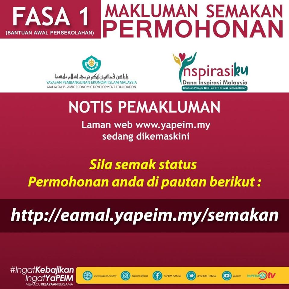 Untuk makluman semakan status permohonan Fasa 1 Dana Inspirasi Malaysia boleh disemak di Laman Web YaPEIM bermula 16 Mac 2020 lepas.
