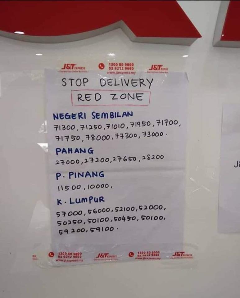 Tular semalam beberapa notis penghantaran beberapa syarikat delivery utama negara mengenai status penghantaran barangan ke dalam kawasan “Red Zone”