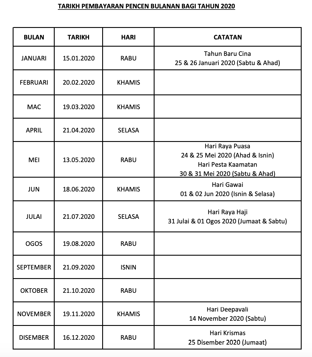 Berikut adalah jadual pembayaran pencen rasmi setiap bulan bagi tahun 2020. Disertakan juga Tarikh dan hari pembayaran setiap bulan untuk memudahkan rujukan anda.