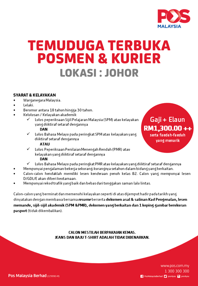 Jawatan Kosong Terkini Temuduga Posmen & Kurier Pos Malaysia.