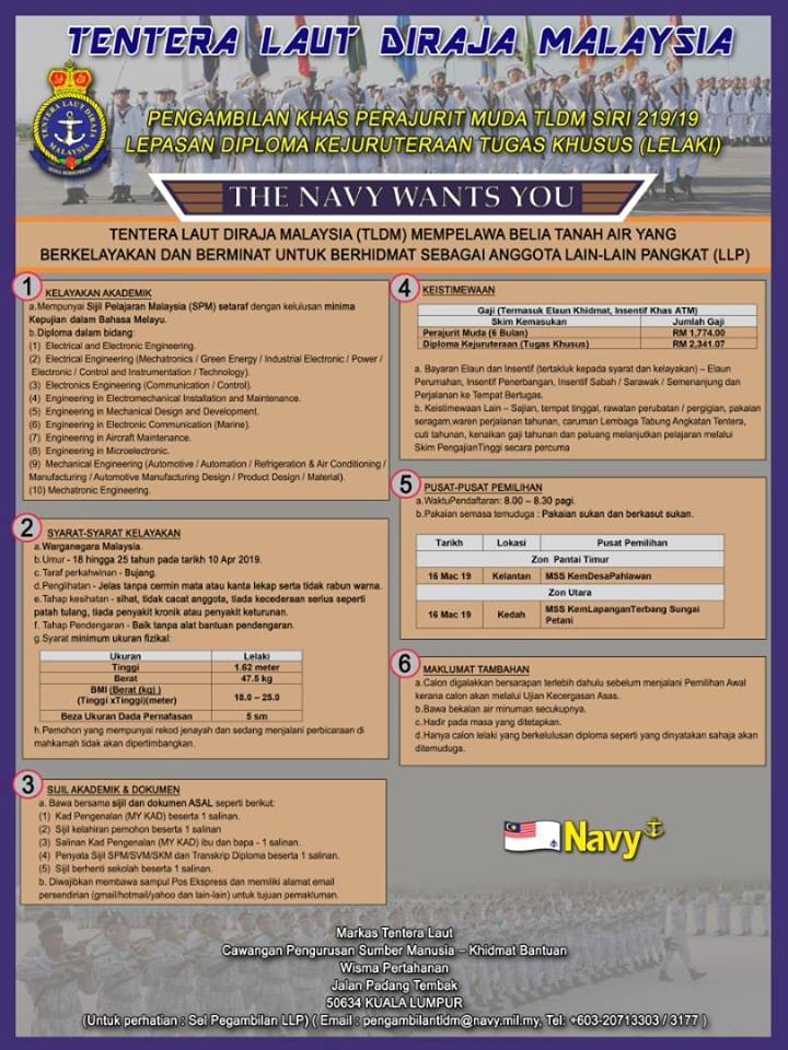 - Nama Majikan: Tentera Laut DiRaja Malaysia (TLDM)