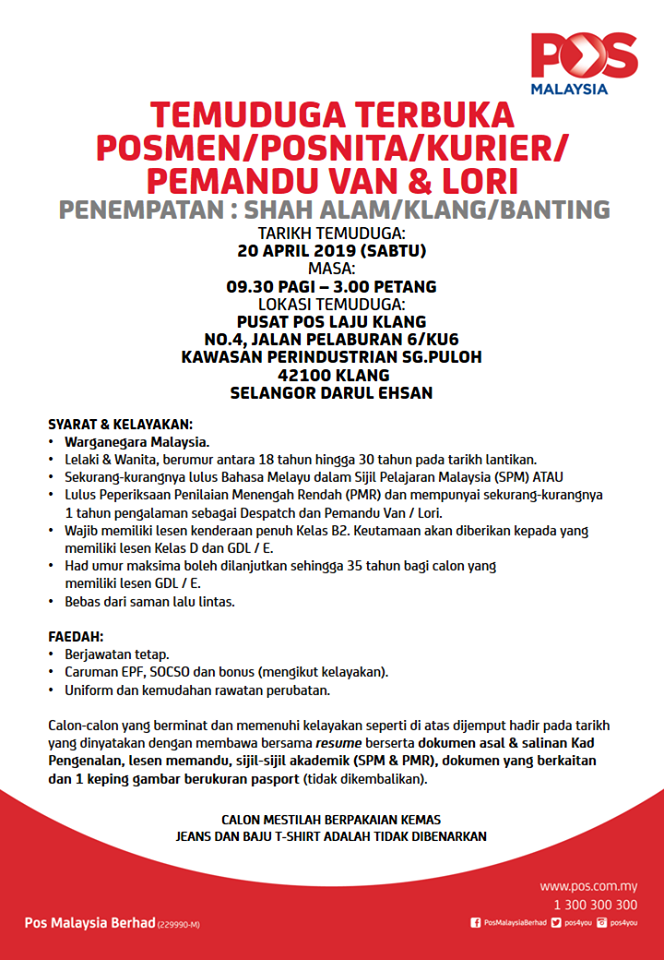 Temuduga Terbuka Pos Malaysia ~ Posmen / Posnita / Kurier / Pemandu Van & Lori