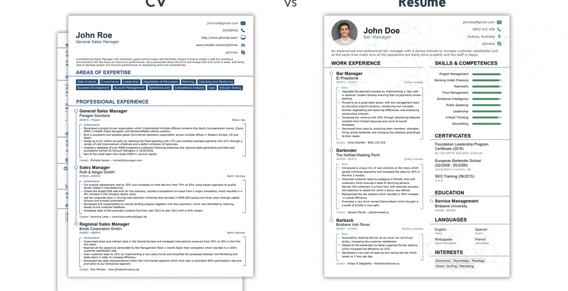 Resume adalah dokumen ringkas yang menumpukan pengisian tentang kemahiran dan pengalaman kerja calon manakala CV adalah dokumen yang lebih panjang yang menumpukan pada pencapaian akademik, penyelidikan dan penerbitan calon.